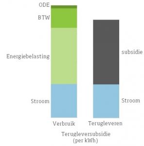 Elke kWh die je verbruikt kost je ongeveer 20 cent, waarvan zo’n 5-7 cent voor de kale stroom. Met zonnepanelen mag je, onder de huidige salderingsregeling, de energie die je verbruikt wegstrepen tegen de energie die je opwekt, inclusief alle belastingen. Stel bijvoorbeeld dat je met jouw zonnepanelen 800 kWh opwekt en je verbruikt 1000 kWh, dan betaal je alleen voor de 200 kWh. Onder de nieuwe terugleversubsidie betaal je voor 1000 kWh en krijg je voor de 800 kWh die je opwekt naast de kale stroom een subsidiebedrag terug.