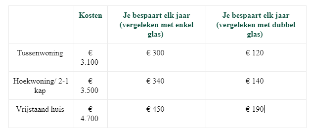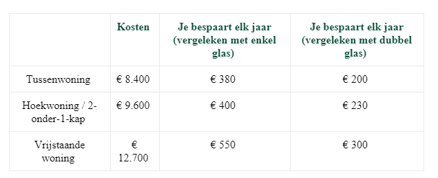 Hieronder zie je wat je bespaart als je in je hele huis HR++ glas laat plaatsen. In bestaande kozijnen.